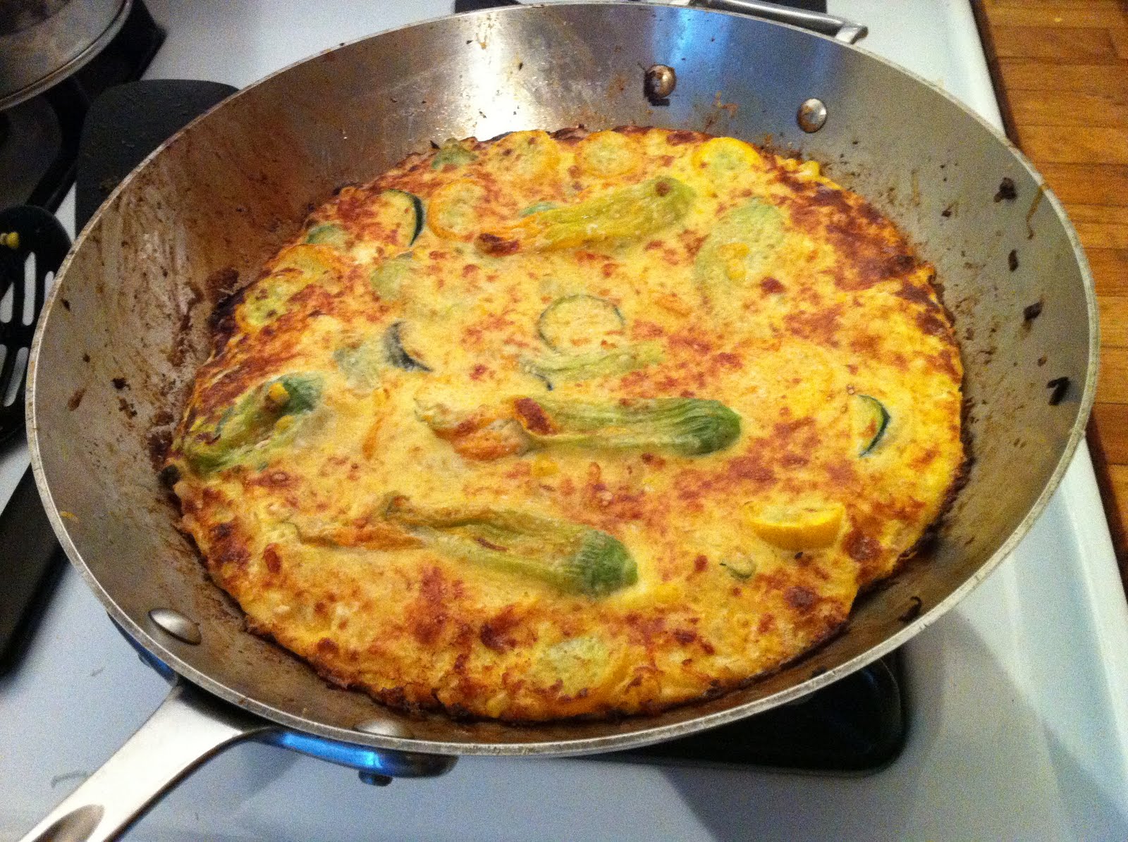 6) Add a little olive oil to pan and return to heat. Add egg mixture, flattening into a pancake shape. Add reserved blossoms to top of eggs, then cover with a thin layer of parmesan.
